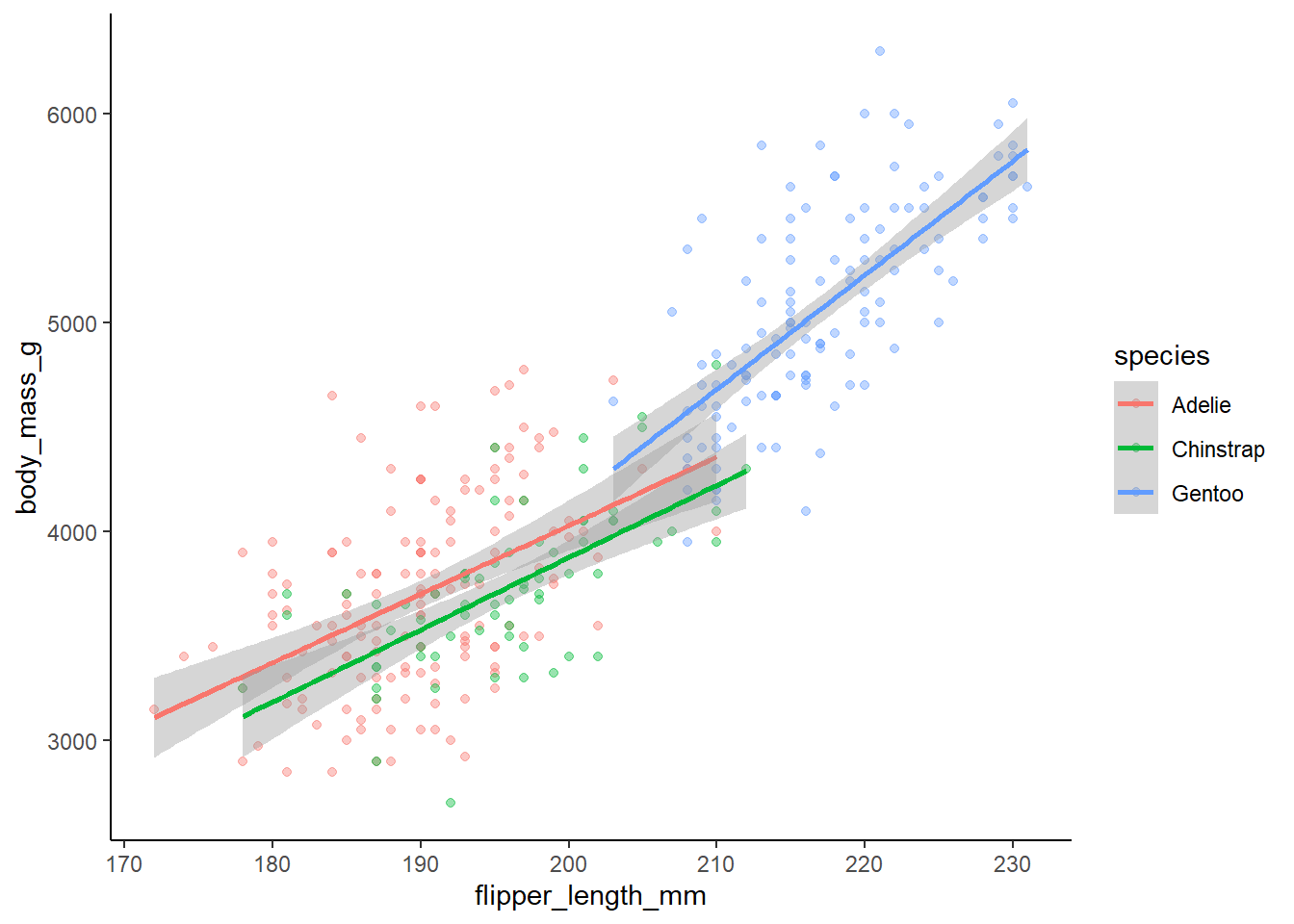 aes(x = flipper_length_mm, y = body_mass_g, colour = species) +
