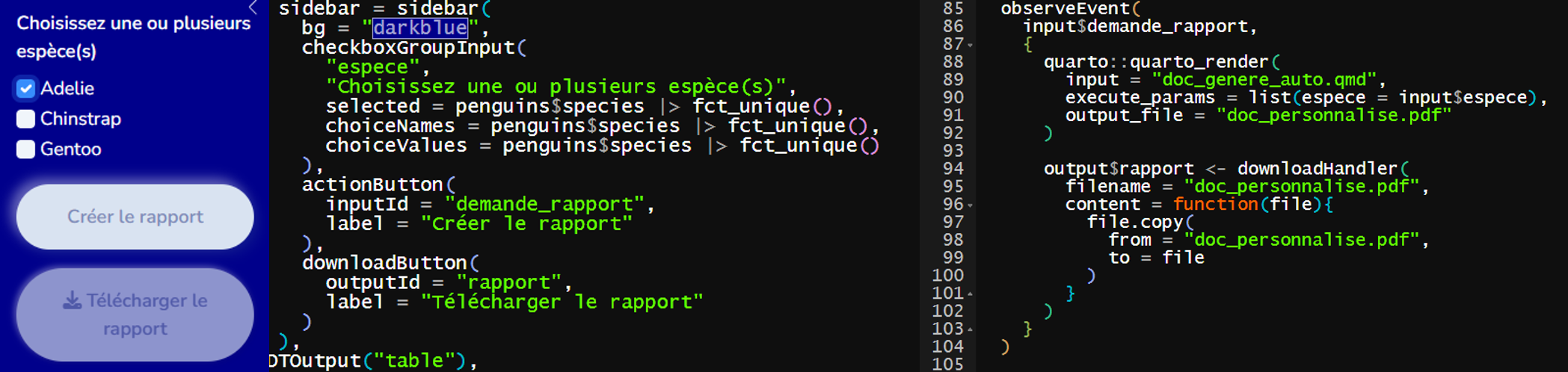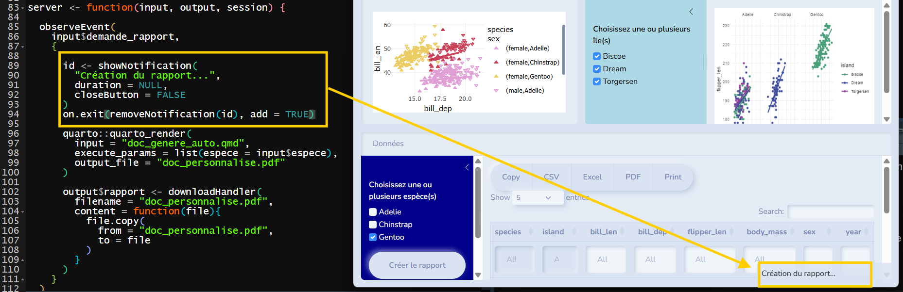 A l’intérieur, la compilation se fait en premier grâce à la fonction quarto_render() puis le document est copié dans la fonction downloadHandler() grâce à la fonction file.copy() du package {base}.