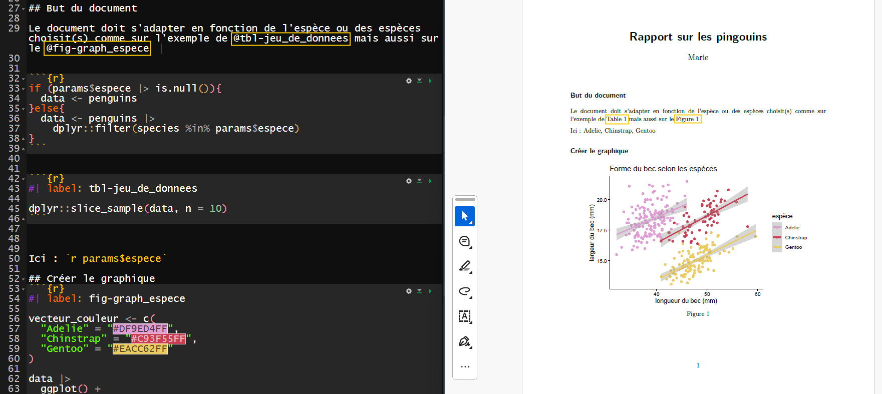 Nommer les chunks de génération de graphique avec fig et de tableau avec tbl permet de faire un lien hypertexte grâce à @fig-graph_espece et @tbl-jeu_de_donnees.